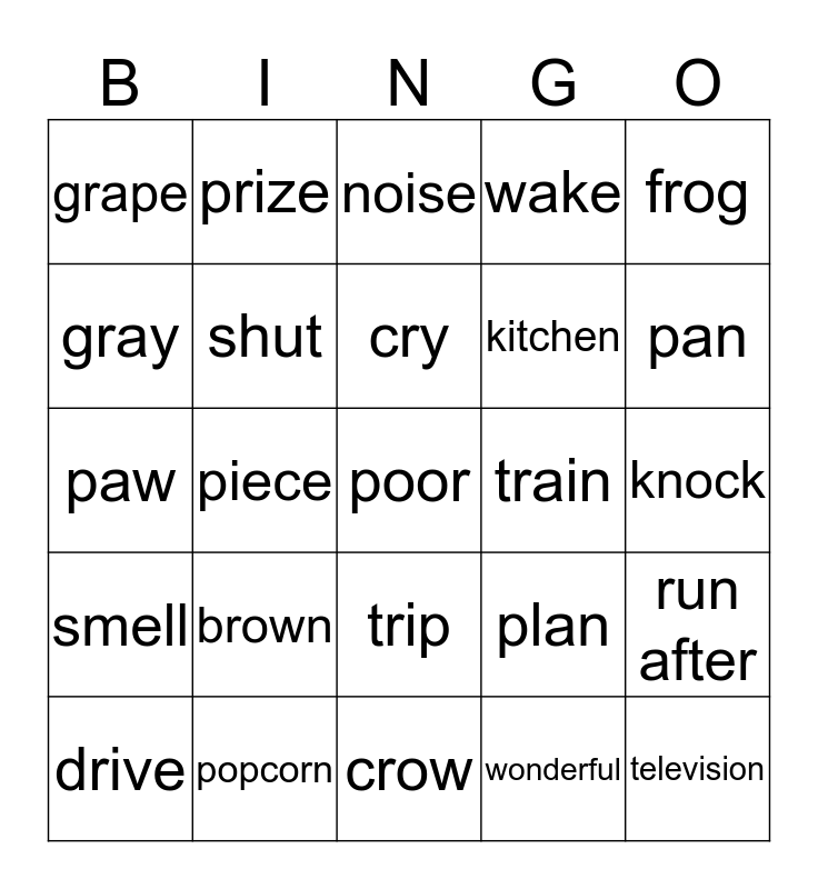 This bingo card has 25 words: brown, crow, cry, drive, frog, grape, gray, prize, train, trip, kitchen, paw, plan, run after, shut, television, knock, noise, pan, piece, poor, popcorn, smell, wake and wonderful.