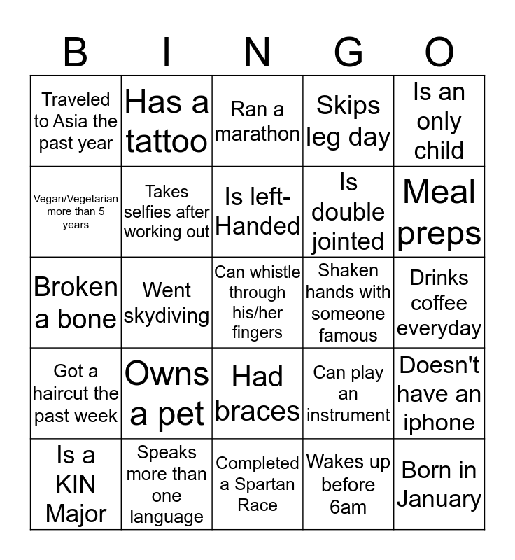 This bingo card has a free space and 24 words: Owns a pet, Speaks more than one language, Is left-Handed, Is a KIN Major, Is an only child, Traveled to Asia the past year, Vegan/Vegetarian more than 5 years, Has a tattoo, Shaken hands with someone famous, Had braces, Is double jointed, Broken a bone, Can play an instrument, Doesn't have an iphone, Takes selfies after working out, Wakes up before 6am, Drinks coffee everyday, Ran a marathon, Meal preps, Went skydiving, Born in January, Got a haircut the past week, Skips leg day and Completed a Spartan Race.