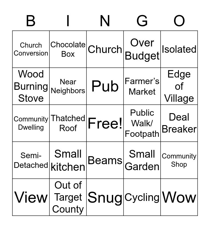 This bingo card has a free space and 33 words: Chickens, Holiday Let, Thatched Roof, Detatched, Semi- Detached, Near Neighbors, Isolated, View, Chocolate Box, Post Office, Pub, Church, Community Hall, Acres, Public Walk/ Footpath, Edge of Village, Out of Target County, Community Dwelling, Small kitchen, Small Garden, Beams, Barn Conversion, Church Conversion, Deal Breaker, Snug, Wow, Over Budget, Farmer’s Market, Wood Burning Stove, Community Shop, Buys a house/ makes offer, Cycling and The Look.