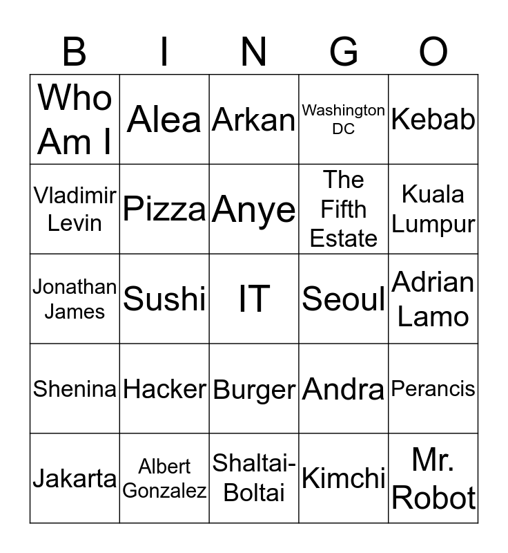 This bingo card has 25 words: Hacker, Shaltai-Boltai, Anye, Jakarta, Kebab, Who Am I, Vladimir Levin, Alea, Seoul, Burger, The Fifth Estate, Jonathan James, Andra, Perancis, Pizza, Mr. Robot, Adrian Lamo, Arkan, Kuala Lumpur, Sushi, IT, Albert Gonzalez, Shenina, Washington DC and Kimchi.