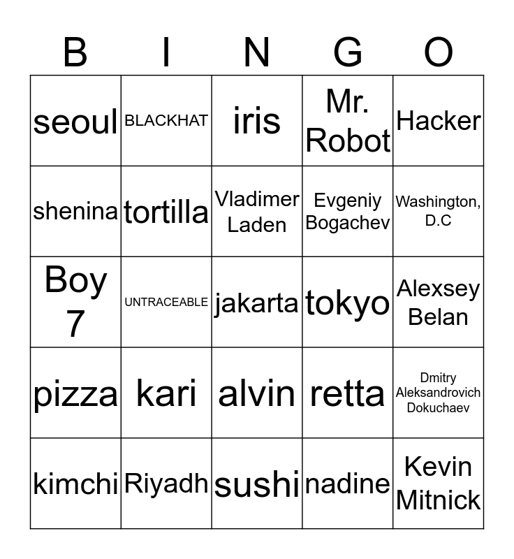 This bingo card has a free space and 24 words: kari, Riyadh, Vladimer Laden, kimchi, Hacker, seoul, shenina, BLACKHAT, tokyo, alvin, Evgeniy Bogachev, Boy 7, retta, Dmitry Aleksandrovich Dokuchaev, tortilla, nadine, Alexsey Belan, iris, Washington, D.C, UNTRACEABLE, Kevin Mitnick, pizza, Mr. Robot and sushi.