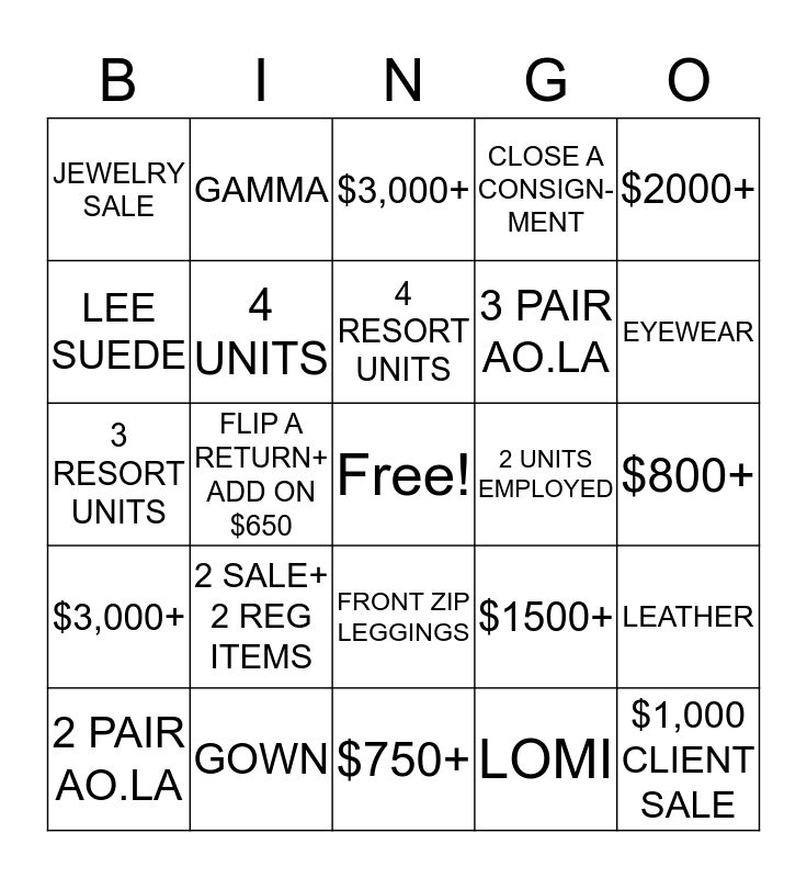 This bingo card has a free space and 24 words: 2 PAIR AO.LA, 2 SALE+ 2 REG ITEMS, 4 RESORT UNITS, LOMI, $2000+, JEWELRY SALE, GAMMA, $3,000+, 2 UNITS EMPLOYED, $800+, 3 RESORT UNITS, 4 UNITS, $1500+, LEATHER, LEE SUEDE, GOWN, $750+, CLOSE A CONSIGN- MENT, EYEWEAR, $3,000+, FLIP A RETURN+ ADD ON $650, FRONT ZIP LEGGINGS, 3 PAIR AO.LA and $1,000 CLIENT SALE.