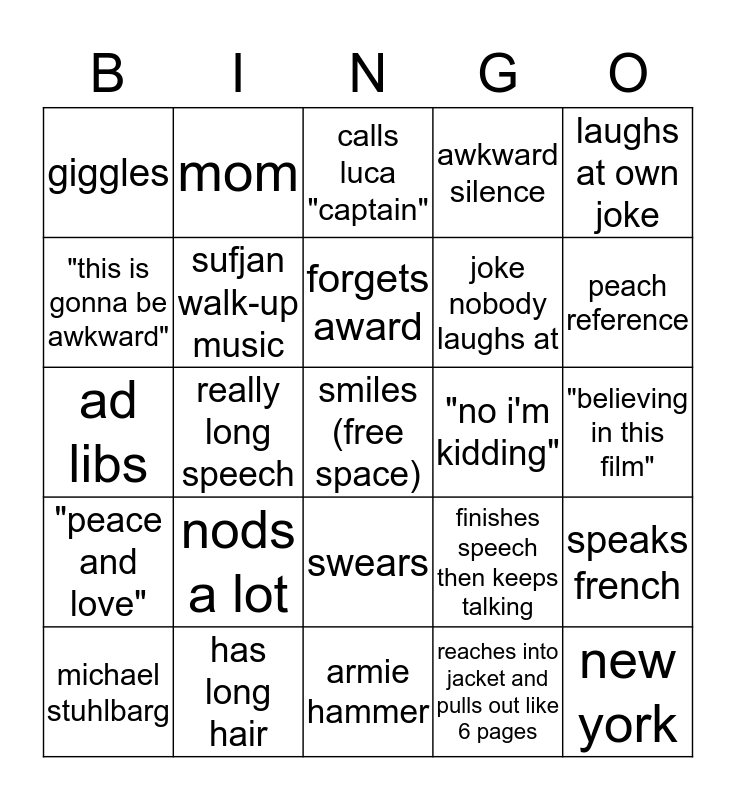 This bingo card has a free space and 24 words: nods a lot, has long hair, forgets award, michael stuhlbarg, laughs at own joke, giggles, "this is gonna be awkward", mom, "no i'm kidding", swears, joke nobody laughs at, ad libs, finishes speech then keeps talking, speaks french, sufjan walk-up music, reaches into jacket and pulls out like 6 pages, "believing in this film", calls luca "captain", peach reference, really long speech, new york, "peace and love", awkward silence and armie hammer.