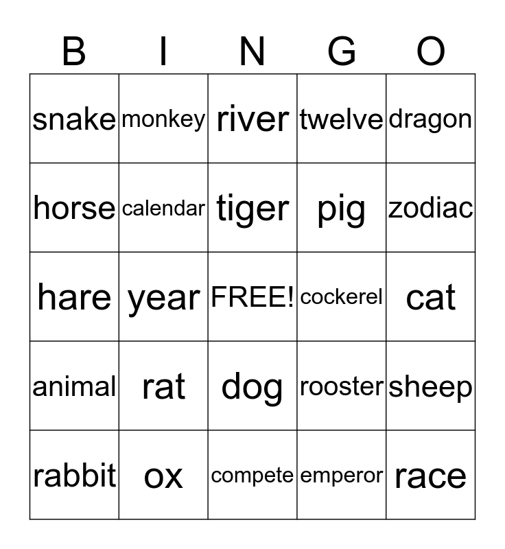 This bingo card has a free space and 24 words: rat, ox, tiger, rabbit, dragon, snake, horse, monkey, cockerel, dog, pig, hare, rooster, sheep, calendar, emperor, cat, river, zodiac, year, race, animal, twelve and compete.