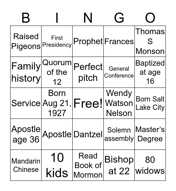 This bingo card has a free space and 47 words: 90 years old, 80 widows, 16th President, Read Book of Mormon, Apostle, Sabbath day, First Presidency, Harvard hospital, Family history, Hates liver, Quorum of the 12, Frances, Master’s Degree, Solemn assembly, Temple, 16 million members, Perfect pitch, Wendy Watson Nelson, Seers, Thomas S Monson, Born Aug 21, 1927, Bishop at 22, Raised Pigeons, General Conference, Heart surgeon, Baptized at age 16, Mandarin Chinese, 93 years old, Dantzel, Apostle age 36, Tommy, Canada Mission, Russell M Nelson, 3 children, President of the Church, 10 kids, Born Salt Lake City, Sustain a new prophet, Wiggled ears, Navy, Reach out & rescue, Prophet, Service, Revelation, Korean War, Pres Kimball’s heart and Revelators.