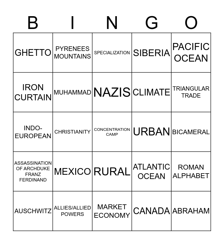 This bingo card has 25 words: MEXICO, MARKET ECONOMY, NAZIS, AUSCHWITZ, PACIFIC OCEAN, GHETTO, IRON CURTAIN, PYRENEES MOUNTAINS, URBAN, RURAL, CLIMATE, INDO-EUROPEAN, ATLANTIC OCEAN, ROMAN ALPHABET, MUHAMMAD, ABRAHAM, BICAMERAL, SPECIALIZATION, TRIANGULAR TRADE, CHRISTIANITY, CONCENTRATION CAMP, ALLIES/ALLIED POWERS, ASSASSINATION OF ARCHDUKE FRANZ FERDINAND, SIBERIA and CANADA.