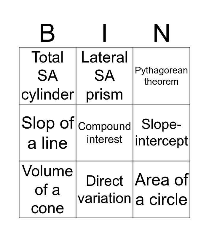 This bingo card has a free space and 8 words: Slope-intercept, Pythagorean theorem, Lateral SA prism, Volume of a cone, Total SA cylinder, Area of a circle, Slop of a line and Direct variation.