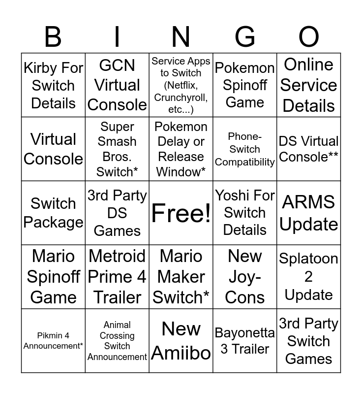 This bingo card has a free space and 24 words: Metroid Prime 4 Trailer, Animal Crossing Switch Announcement, Pokemon Delay or Release Window*, Pikmin 4 Announcement*, Online Service Details, Kirby For Switch Details, Virtual Console, GCN Virtual Console, Yoshi For Switch Details, Mario Maker Switch*, Phone-Switch Compatibility, Switch Package, New Joy-Cons, Splatoon 2 Update, Super Smash Bros. Switch*, Bayonetta 3 Trailer, ARMS Update, Service Apps to Switch (Netflix, Crunchyroll, etc...), DS Virtual Console**, 3rd Party DS Games, 3rd Party Switch Games, Mario Spinoff Game, Pokemon Spinoff Game and New Amiibo.