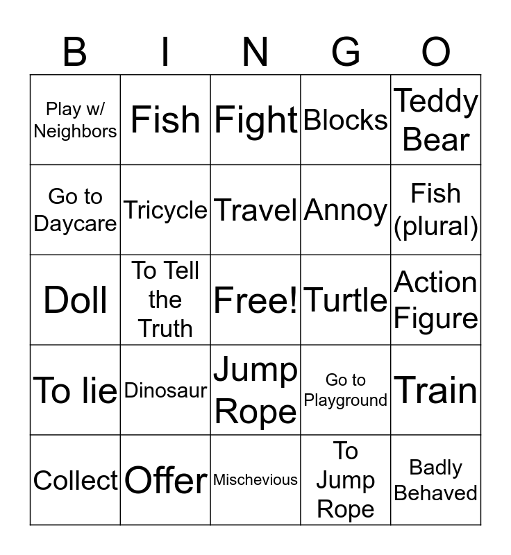 This bingo card has a free space and 24 words: Dinosaur, Offer, Travel, Collect, Teddy Bear, Play w/ Neighbors, Go to Daycare, Fish, Turtle, Jump Rope, Annoy, Doll, Go to Playground, Train, Tricycle, To Jump Rope, Action Figure, Fight, Fish (plural), To Tell the Truth, Badly Behaved, To lie, Blocks and Mischevious.