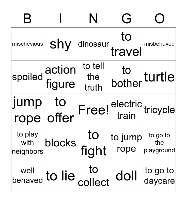 This bingo card has a free space and 24 words: blocks, to lie, to tell the truth, well behaved, misbehaved, mischevious, spoiled, shy, electric train, to fight, to bother, jump rope, to jump rope, to go to the playground, action figure, doll, tricycle, dinosaur, turtle, to offer, to go to daycare, to play with neighbors, to travel and to collect.