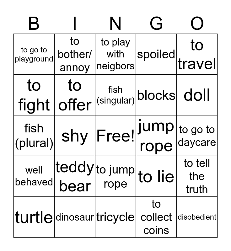 This bingo card has a free space and 24 words: teddy bear, dinosaur, fish (singular), turtle, to travel, to go to playground, to fight, to bother/ annoy, jump rope, to jump rope, blocks, fish (plural), to lie, to tell the truth, to offer, to collect coins, to go to daycare, to play with neigbors, doll, shy, disobedient, well behaved, spoiled and tricycle.