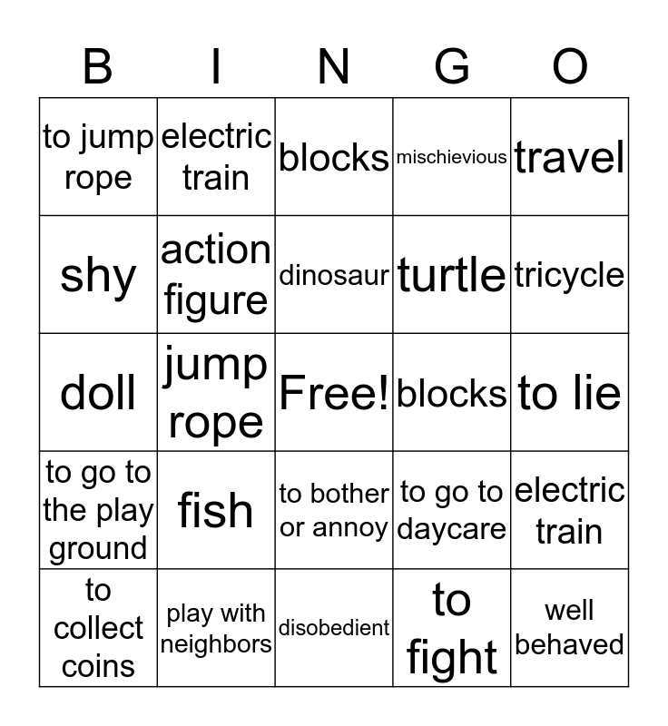 This bingo card has a free space and 24 words: fish, play with neighbors, dinosaur, to collect coins, travel, to jump rope, shy, electric train, blocks, to bother or annoy, turtle, doll, to go to daycare, electric train, action figure, to fight, to lie, blocks, tricycle, jump rope, well behaved, to go to the play ground, mischievious and disobedient.