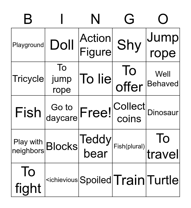 This bingo card has a free space and 24 words: Blocks, <ichievious, To lie, To fight, Jump rope, Playground, Tricycle, Doll, Collect coins, Teddy bear, To offer, Fish, Fish(plural), To travel, To jump rope, Train, Dinosaur, Action Figure, Well Behaved, Go to daycare, Turtle, Play with neighbors, Shy and Spoiled.