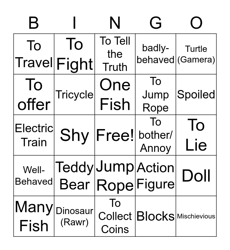 This bingo card has a free space and 24 words: Teddy Bear, Dinosaur (Rawr), One Fish, Many Fish, Turtle (Gamera), To Travel, To offer, To Fight, To bother/ Annoy, Jump Rope, To Jump Rope, Electric Train, Action Figure, Doll, Tricycle, Blocks, To Lie, To Tell the Truth, Spoiled, Shy, Mischievious, Well-Behaved, badly-behaved and To Collect Coins.