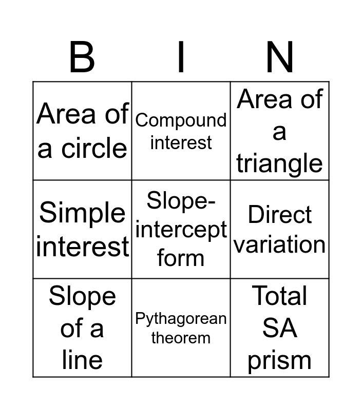 This bingo card has a free space and 8 words: Direct variation, Area of a triangle, Compound interest, Slope of a line, Area of a circle, Total SA prism, Simple interest and Pythagorean theorem.