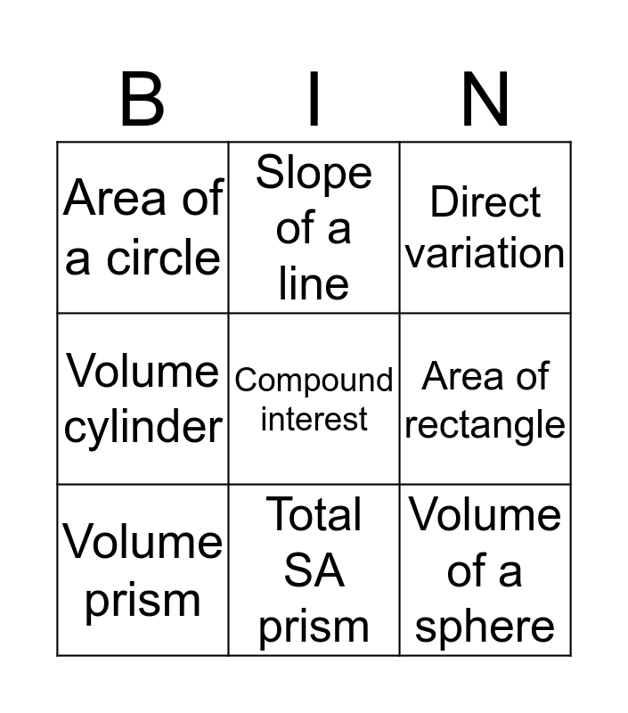 This bingo card has 9 words: Volume prism, Direct variation, Slope of a line, Volume cylinder, Area of a circle, Area of rectangle, Compound interest, Volume of a sphere and Total SA prism.