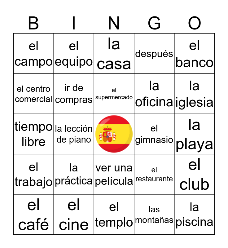 This bingo card has a free space and 29 words: el café, el parque, la lección de piano, la reunión, el campo, la casa, ir de compras, la práctica, el gimnasio, el cine, la playa, la piscina, el templo, las montañas, la iglesia, la biblioteca, ver una película, el trabajo, el banco, tiempo libre, el restaurante, la farmacia, la oficina, el centro comercial, después, el equipo, el club, el supermercado and ¡No me digas!.