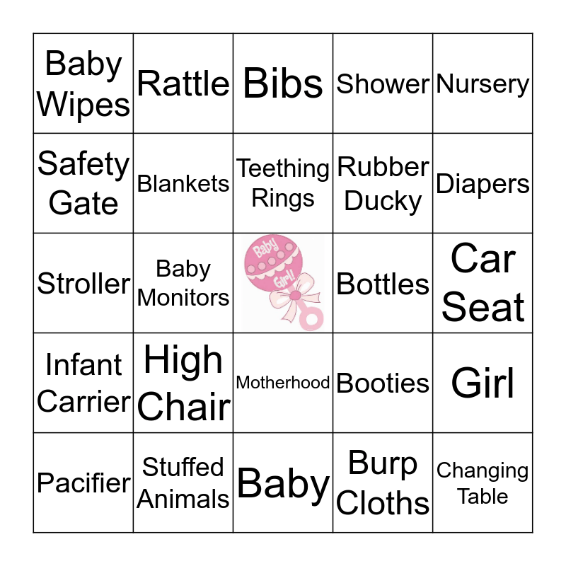 This bingo card has a free space and 31 words: Baby, Baby Bathtub, Baby Monitors, Baby Shampoo, Baby Wipes, Bibs, Blankets, Booties, Bottles, Burp Cloths, Car Seat, Changing Table, Crib, Diaper Bag, Diapers, Family, Girl, High Chair, Infant Carrier, Motherhood, Nursery, Nursing, Pacifier, Rattle, Rubber Ducky, Safety Gate, Shower, Stroller, Stuffed Animals, Teething Rings and Toys.