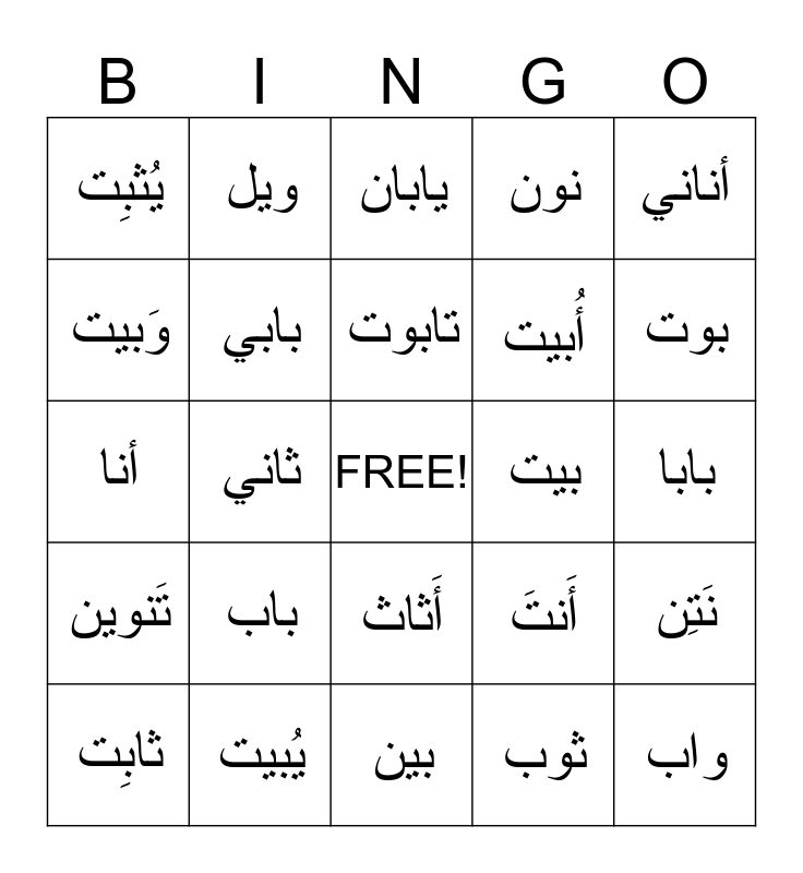 This bingo card has a free space and 29 words: ثابِت, تَثْبيت, ثاني, تَنين, يُثبِت, يابان, بابي, باب, بيت, يُبيت, بابا, واب, بين, ثوب, بوت, يونان, أَثاث, تَنوين, أناني, أنا, أَنتَ, أنتِ, أُبيت, وَبيت, نون, ويل, نَتِن, تابوت and وبا.