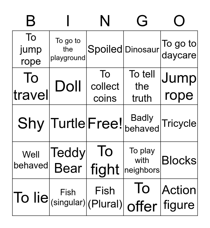 This bingo card has a free space and 24 words: Teddy Bear, Fish (singular), To collect coins, To lie, To go to daycare, To jump rope, To travel, To go to the playground, Badly behaved, To fight, To tell the truth, Shy, To play with neighbors, Blocks, Doll, To offer, Tricycle, Spoiled, Jump rope, Turtle, Action figure, Well behaved, Dinosaur and Fish (Plural).