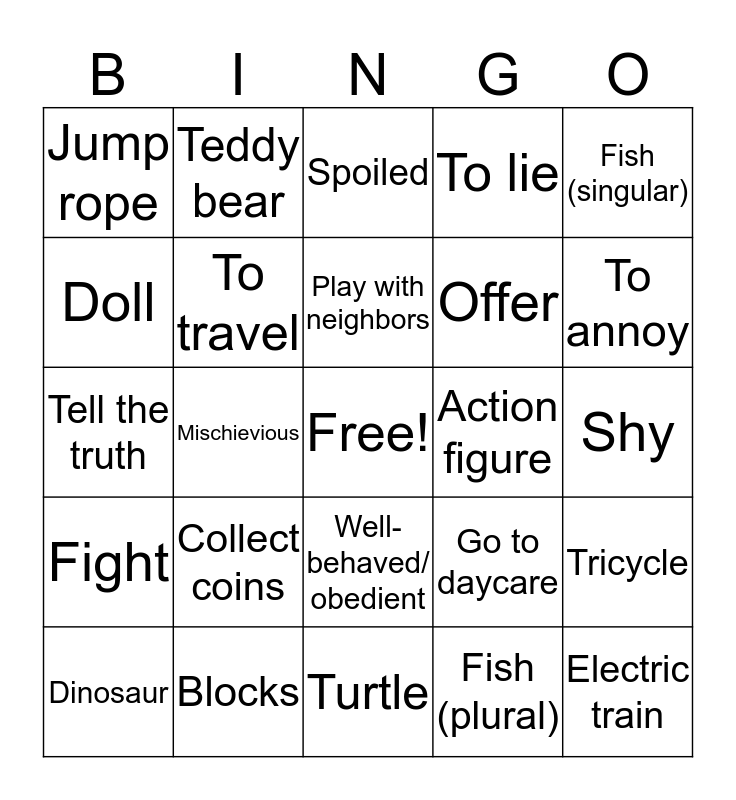 This bingo card has a free space and 24 words: Collect coins, Blocks, Play with neighbors, Dinosaur, Fish (singular), Jump rope, Doll, Teddy bear, Action figure, Well-behaved/ obedient, Offer, Tell the truth, Go to daycare, Tricycle, To travel, Fish (plural), Shy, Spoiled, To annoy, Mischievious, Electric train, Fight, To lie and Turtle.