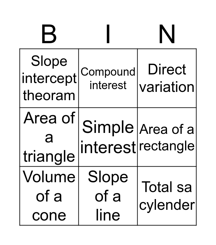 This bingo card has a free space and 8 words: Area of a rectangle, Direct variation, Compound interest, Volume of a cone, Slope intercept theoram, Total sa cylender, Area of a triangle and Slope of a line.