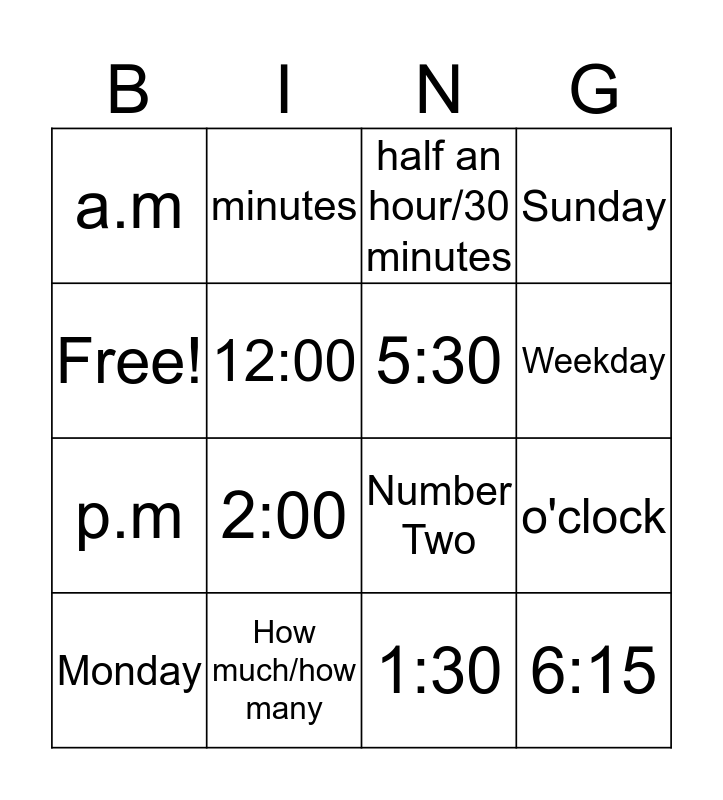This bingo card has 16 words: How much/how many, o'clock, half an hour/30 minutes, a.m, p.m, minutes, Number Two, 1:30, Free!, 12:00, Monday, Sunday, 2:00, Weekday, 5:30 and 6:15.