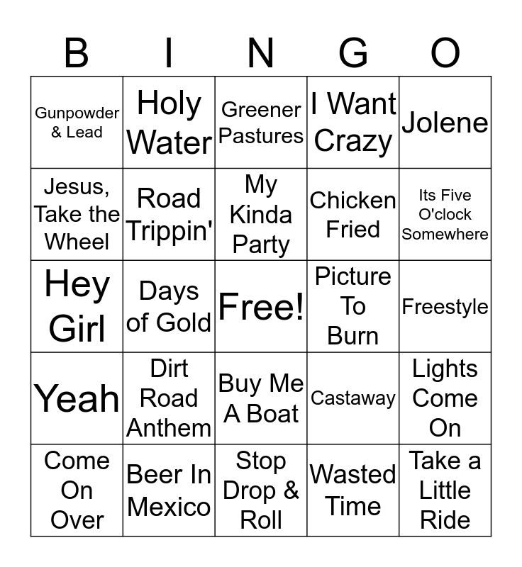 This bingo card has a free space and 24 words: Dirt Road Anthem, Beer In Mexico, My Kinda Party, Come On Over, Jolene, Gunpowder & Lead, Jesus, Take the Wheel, Holy Water, Picture To Burn, Buy Me A Boat, Chicken Fried, Hey Girl, Castaway, Lights Come On, Road Trippin', Wasted Time, Freestyle, Greener Pastures, Its Five O'clock Somewhere, Days of Gold, Take a Little Ride, Yeah, I Want Crazy and Stop Drop & Roll.