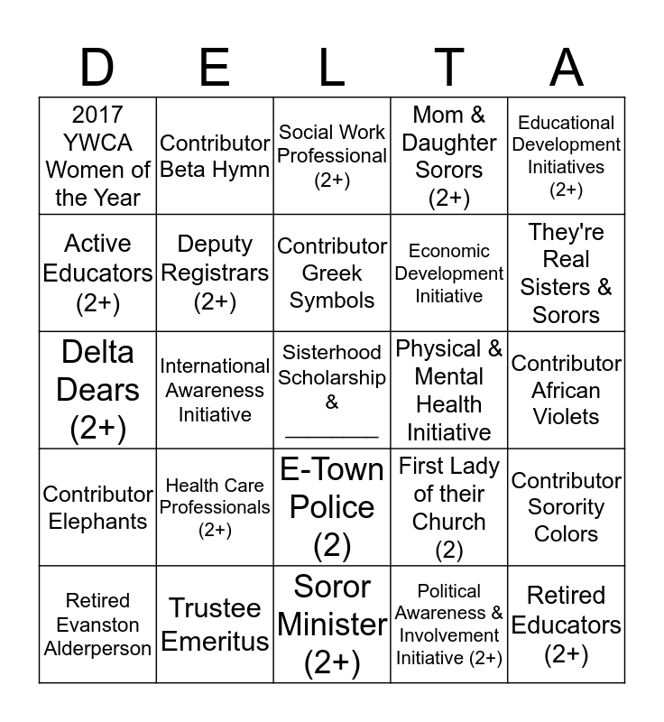 This bingo card has a free space and 24 words: Health Care Professionals (2+), Trustee Emeritus, Contributor Greek Symbols, Retired Evanston Alderperson, Educational Development Initiatives (2+), 2017 YWCA Women of the Year, Active Educators (2+), Contributor Beta Hymn, Physical & Mental Health Initiative, E-Town Police (2), Economic Development Initiative, Delta Dears (2+), First Lady of their Church (2), Contributor Sorority Colors, Deputy Registrars (2+), Political Awareness & Involvement Initiative (2+), Contributor African Violets, Social Work Professional (2+), They're Real Sisters & Sorors, International Awareness Initiative, Retired Educators (2+), Contributor Elephants, Mom & Daughter Sorors (2+) and Soror Minister (2+).