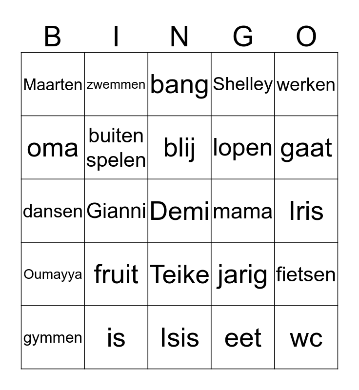 This bingo card has 33 words: wc, Leona, Gianni, Sara, Oumayya, buiten spelen, werken, gymmen, zwemmen, boos, blij, bang, verdrietig, papa, mama, gaat, is, dansen, fruit, jarig, Teike, Sem, Maarten, Iris, Isis, Demi, Shelley, lopen, oma, fietsen, ziet, eet and lunch.