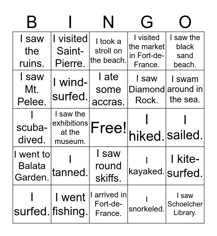 This bingo card has a free space and 24 words: I tanned., I went fishing., I ate some accras., I surfed., I saw the black sand beach., I saw the ruins., I saw Mt. Pelee., I visited Saint-Pierre., I hiked., I saw round skiffs., I saw Diamond Rock., I scuba-dived., I kayaked., I kite-surfed., I wind-surfed., I snorkeled., I sailed., I took a stroll on the beach., I swam around in the sea., I saw the exhibitions at the museum., I saw Schoelcher Library., I went to Balata Garden., I visited the market in Fort-de-France. and I arrived in Fort-de-France..