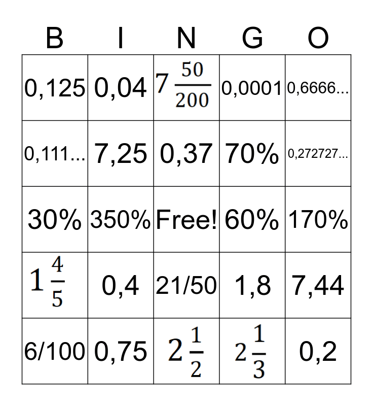 This bingo card has 4 images, a free space and 20 words: 0,4, 0,75, 0,37, 6/100, 0,6666..., 0,125, 0,111..., 0,04, 60%, 21/50, 70%, 30%, 1,8, 7,44, 7,25, 170%, 0,272727..., 350%, 0,2 and 0,0001.