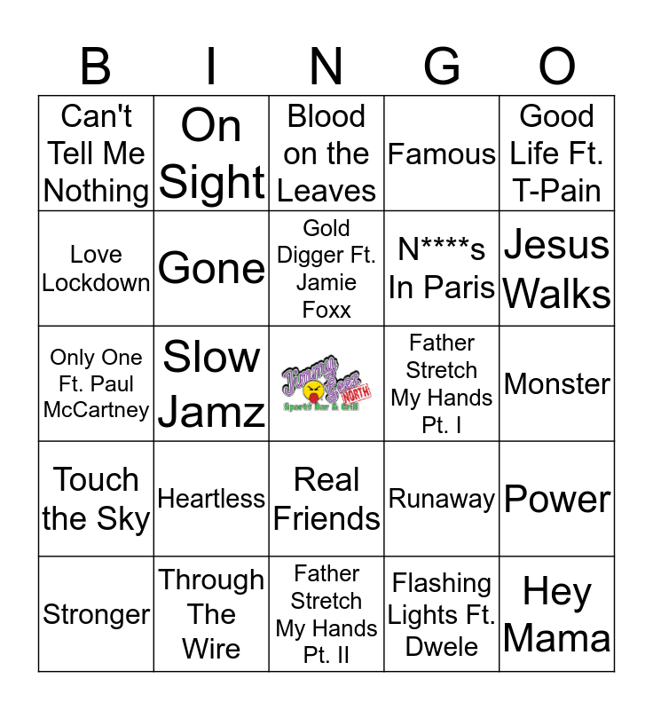 This bingo card has a free space and 24 words: Heartless, Through The Wire, Gold Digger Ft. Jamie Foxx, Stronger, Good Life Ft. T-Pain, Can't Tell Me Nothing, Love Lockdown, On Sight, Father Stretch My Hands Pt. I, Real Friends, N****s In Paris, Only One Ft. Paul McCartney, Runaway, Power, Gone, Flashing Lights Ft. Dwele, Monster, Blood on the Leaves, Jesus Walks, Slow Jamz, Hey Mama, Touch the Sky, Famous and Father Stretch My Hands Pt. II.