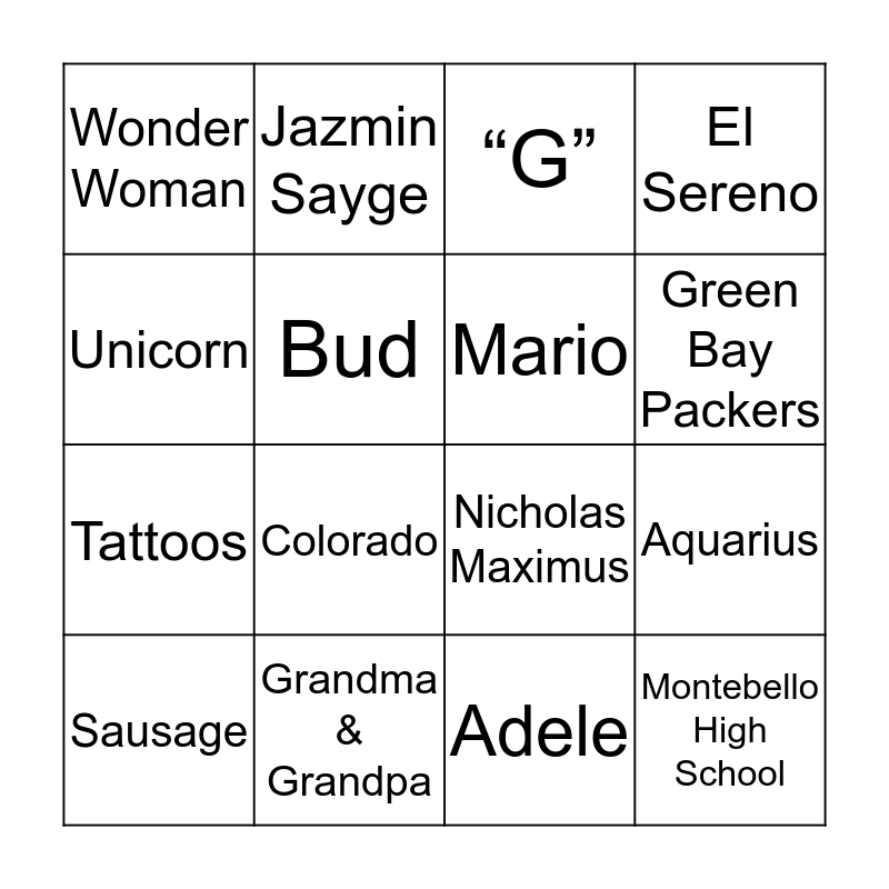 This bingo card has 16 words: Grandma & Grandpa, Aquarius, “G”, Wonder Woman, Tattoos, Jazmin Sayge, Nicholas Maximus, Adele, Unicorn, Bud, Sausage, El Sereno, Colorado, Green Bay Packers, Mario and Montebello High School.
