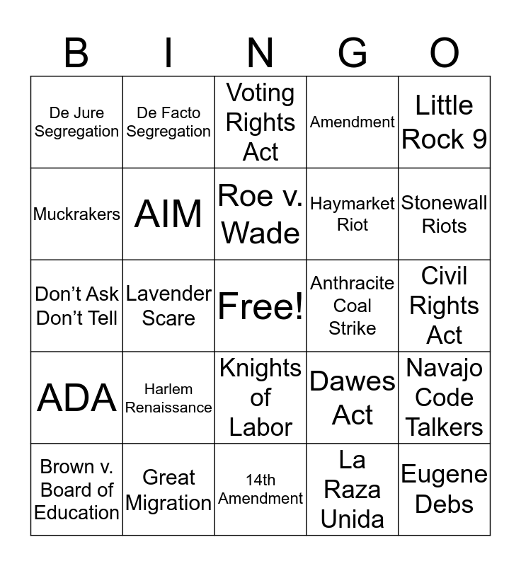 This bingo card has a free space and 24 words: Harlem Renaissance, Great Migration, Roe v. Wade, Brown v. Board of Education, Little Rock 9, De Jure Segregation, Muckrakers, De Facto Segregation, Anthracite Coal Strike, Knights of Labor, Haymarket Riot, Don’t Ask Don’t Tell, Dawes Act, Navajo Code Talkers, AIM, La Raza Unida, Civil Rights Act, Voting Rights Act, Stonewall Riots, Lavender Scare, Eugene Debs, ADA, Amendment and 14th Amendment.