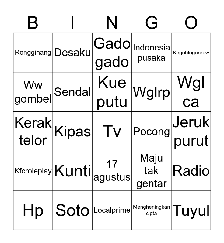 This bingo card has a free space and 24 words: Kunti, Soto, Kue putu, Hp, Kegobloganrpw, Rengginang, Ww gombel, Desaku, Pocong, 17 agustus, Wglrp, Kerak telor, Maju tak gentar, Radio, Sendal, Mengheningkan cipta, Jeruk purut, Gado gado, Wgl ca, Kipas, Tuyul, Kfcroleplay, Indonesia pusaka and Localprime.