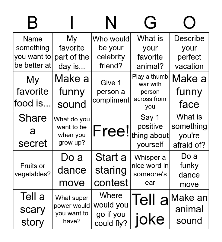This bingo card has a free space and 24 words: Tell a scary story, Do a dance move, Give 1 person a compliment, Tell a joke, Describe your perfect vacation, Name something you want to be better at, My favorite part of the day is..., Who would be your celebrity friend?, Say 1 positive thing about yourself, What is something you're afraid of?, Share a secret, Make a funny sound, Whisper a nice word in someone's ear, Do a funky dance move, My favorite food is..., What super power would you want to have?, Where would you go if you could fly?, What is your favorite animal?, Make a funny face, Fruits or vegetables?, What do you want to be when you grow up?, Start a staring contest, Play a thumb war with person across from you and Make an animal sound.