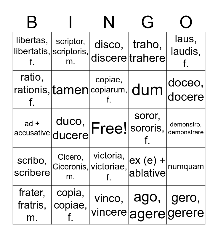 This bingo card has a free space and 24 words: Cicero, Ciceronis, m., copia, copiae, f., copiae, copiarum, f., frater, fratris, m., laus, laudis, f., libertas, libertatis, f., ratio, rationis, f., scriptor, scriptoris, m., soror, sororis, f., victoria, victoriae, f., dum, ad + accusative, ex (e) + ablative, numquam, tamen, ago, agere, demonstro, demonstrare, disco, discere, doceo, docere, duco, ducere, gero, gerere, scribo, scribere, traho, trahere and vinco, vincere.