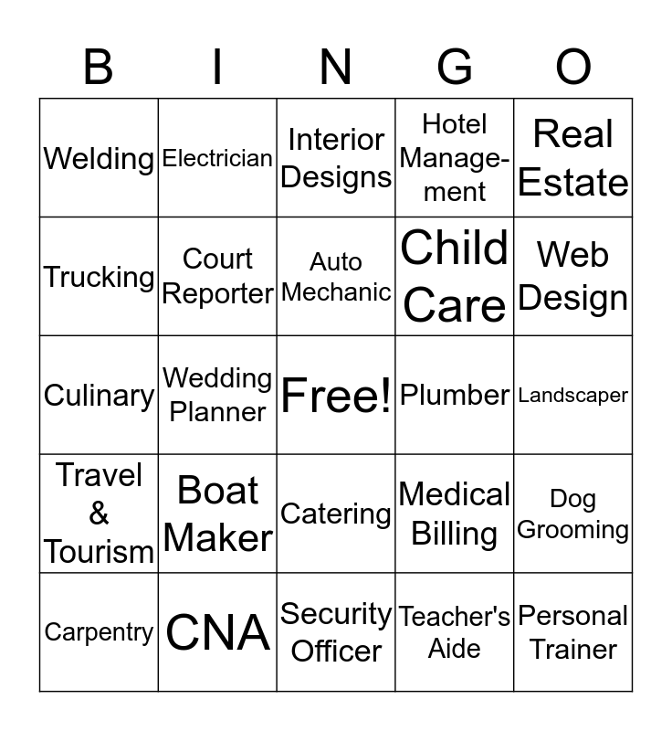 This bingo card has a free space and 24 words: Boat Maker, CNA, Auto Mechanic, Carpentry, Real Estate, Welding, Trucking, Electrician, Plumber, Catering, Child Care, Culinary, Medical Billing, Dog Grooming, Court Reporter, Teacher's Aide, Landscaper, Interior Designs, Web Design, Wedding Planner, Personal Trainer, Travel & Tourism, Hotel Manage-ment and Security Officer.