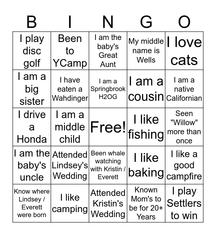 This bingo card has a free space and 24 words: Attended Lindsey's Wedding, I like camping, I am a Springbrook H2OG, Know where Lindsey / Everett were born, I love cats, I play disc golf, I am a big sister, Been to YCamp, I like fishing, Been whale watching with Kristin / Everett, I am a cousin, I drive a Honda, I like baking, I like a good campfire, I have eaten a Wahdinger, Known Mom's to be for 20+ Years, Seen "Willow" more than once, I am the baby's Great Aunt, I am a native Californian, I am a middle child, I play Settlers to win, I am the baby's uncle, My middle name is Wells and Attended Kristin's Wedding.