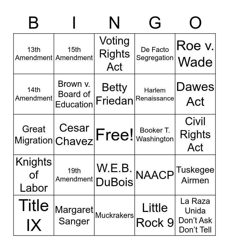 This bingo card has a free space and 24 words: 19th Amendment, Margaret Sanger, Betty Friedan, Title IX, Roe v. Wade, 13th Amendment, 14th Amendment, 15th Amendment, Booker T. Washington, W.E.B. DuBois, Harlem Renaissance, Great Migration, NAACP, Tuskegee Airmen, Brown v. Board of Education, Little Rock 9, Civil Rights Act, Voting Rights Act, Dawes Act, Cesar Chavez, La Raza Unida Don’t Ask Don’t Tell, Knights of Labor, De Facto Segregation and Muckrakers.