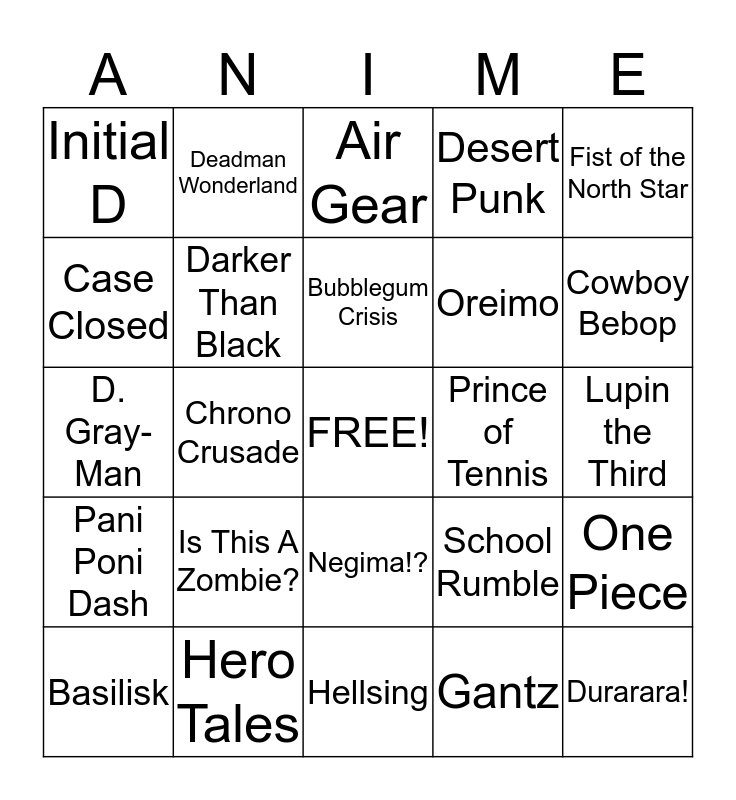 This bingo card has a free space and 74 words: .hack//SIGN, A Certain Scientific Railgun, Air Gear, Akira, Aquarion, Attack on Titan, Baka and Test, Bamboo Blade, Basilisk, Black Butler, Blood Plus, Bleach, Bubblegum Crisis, Case Closed, Chobits, Chrono Crusade, Code Geass, Cowboy Bebop, Claymore, D. Gray-Man, Darker Than Black, Deadman Wonderland, Desert Punk, Dragon Ball Z, Durarara!, Ergo Proxy, Eureka Seven, Excel Saga, Fairy Tail, Fate/Stay Night, Fist of the North Star, Fooly Cooly (FLCL), Fruits Basket, Full Metal Panic, Full Metal Alchemist, Gantz, Ghost Hunt, Gintama, Gun X Sword, Gurren Lagann, Hellsing, Hero Tales, Hetalia, High School DxD, High School of the Dead, Initial D, Inuyasha, Is This A Zombie?, Kaleido Star, Kanon, Last Exile, Love Hina, Lupin the Third, Mai-Hime, Melencholy of Haruhi Suzumiya, Mushi-Shi, Negima!?, Noir, Oh! Edo Rocket, One Piece, Oreimo, Ouran High School Host Club, Pani Poni Dash, Panty and Stocking with Garterbelt, Prince of Tennis, Rosario + Vampire, Ruroni Kenshin, Samurai 7, School Rumble, Skip Beat!, Soul Eater, Sword Art Online, Trigun and Uta No Prince Sama.