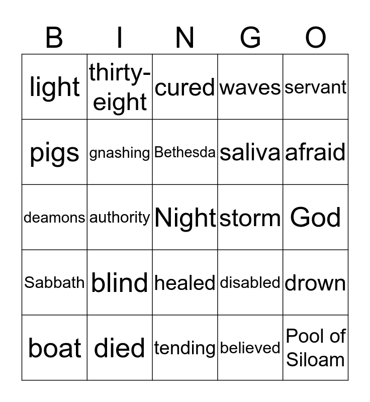 This bingo card has 25 words: blind, tending, Bethesda, boat, servant, light, pigs, thirty- eight, storm, healed, saliva, deamons, disabled, drown, gnashing, Pool of Siloam, God, cured, afraid, authority, Night, died, Sabbath, waves and believed.