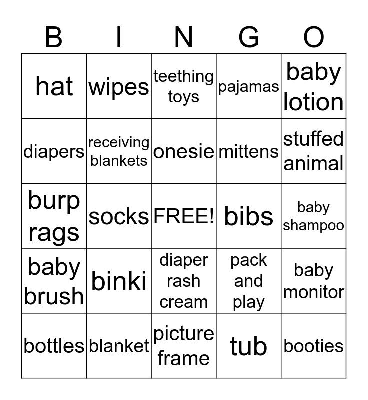This bingo card has a free space and 24 words: binki, blanket, onesie, bottles, baby lotion, hat, diapers, wipes, bibs, diaper rash cream, mittens, burp rags, pack and play, baby monitor, receiving blankets, tub, baby shampoo, teething toys, stuffed animal, socks, booties, baby brush, pajamas and picture frame.