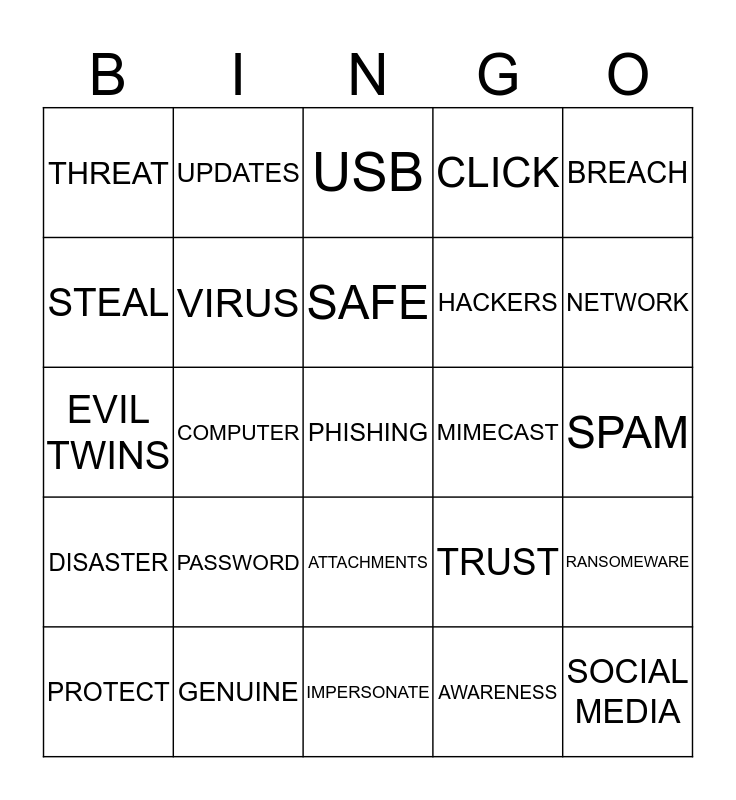 This bingo card has 38 words: Free!, SECURITY, CRYPTOLOCKER, VIRUS, RANSOMEWARE, PASSWORD, SAFE, DATA, BREACH, HACKERS, COMPUTER, CLICK, PHISHING, SPAM, STEAL, DISASTER, PASSWORD, USB, WIFI, MIMECAST, THREAT, GENUINE, NETWORK, PROTECT, CRIMINALS, IMPERSONATE, SOCIAL MEDIA, DISRUPT, EXPOSE, PARADISE PAPERS, ENCRYPTED, ATTACHMENTS, AWARENESS, UPDATES, PHISHY, TRUST, EVIL TWINS and IGUANA.