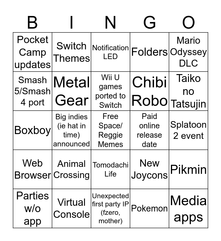 This bingo card has a free space and 24 words: Animal Crossing, Virtual Console, Wii U games ported to Switch, Parties w/o app, Mario Odyssey DLC, Pocket Camp updates, Smash 5/Smash 4 port, Switch Themes, Paid online release date, Tomodachi Life, Chibi Robo, Boxboy, New Joycons, Pikmin, Metal Gear, Pokemon, Splatoon 2 event, Notification LED, Taiko no Tatsujin, Big indies (ie hat in time) announced, Media apps, Web Browser, Folders and Unexpected first party IP (fzero, mother).