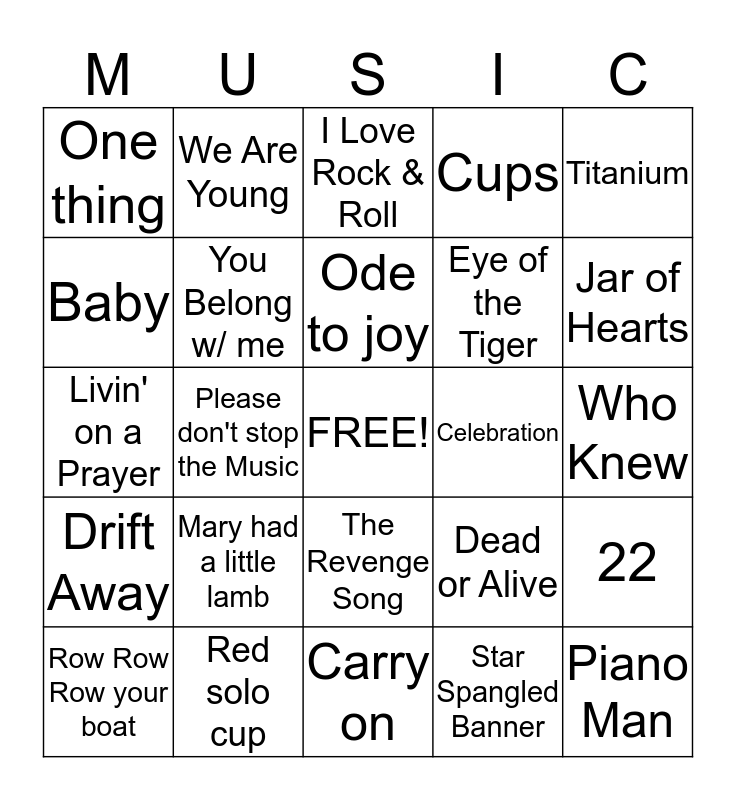 This bingo card has a free space and 24 words: Mary had a little lamb, Red solo cup, Ode to joy, Row Row Row your boat, Titanium, One thing, Baby, We Are Young, Celebration, The Revenge Song, Eye of the Tiger, Livin' on a Prayer, Dead or Alive, 22, You Belong w/ me, Star Spangled Banner, Who Knew, I Love Rock & Roll, Jar of Hearts, Please don't stop the Music, Piano Man, Drift Away, Cups and Carry on.