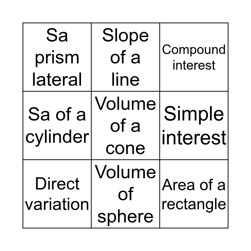 This bingo card has a free space and 8 words: Simple interest, Compound interest, Slope of a line, Direct variation, Sa prism lateral, Area of a rectangle, Sa of a cylinder and Volume of sphere.