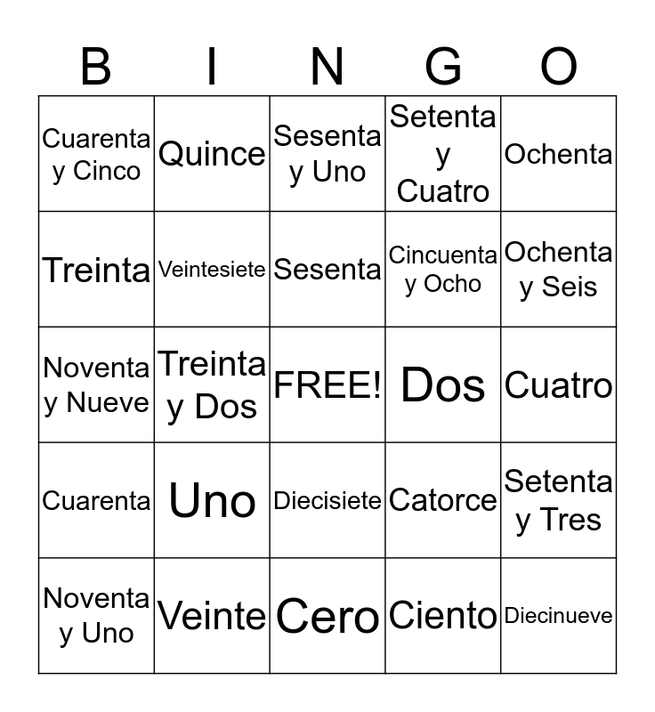 This bingo card has a free space and 24 words: Uno, Veinte, Sesenta, Noventa y Uno, Ochenta, Cuarenta y Cinco, Treinta, Quince, Dos, Diecisiete, Cincuenta y Ocho, Noventa y Nueve, Catorce, Setenta y Tres, Veintesiete, Ciento, Cuatro, Sesenta y Uno, Ochenta y Seis, Treinta y Dos, Diecinueve, Cuarenta, Setenta y Cuatro and Cero.