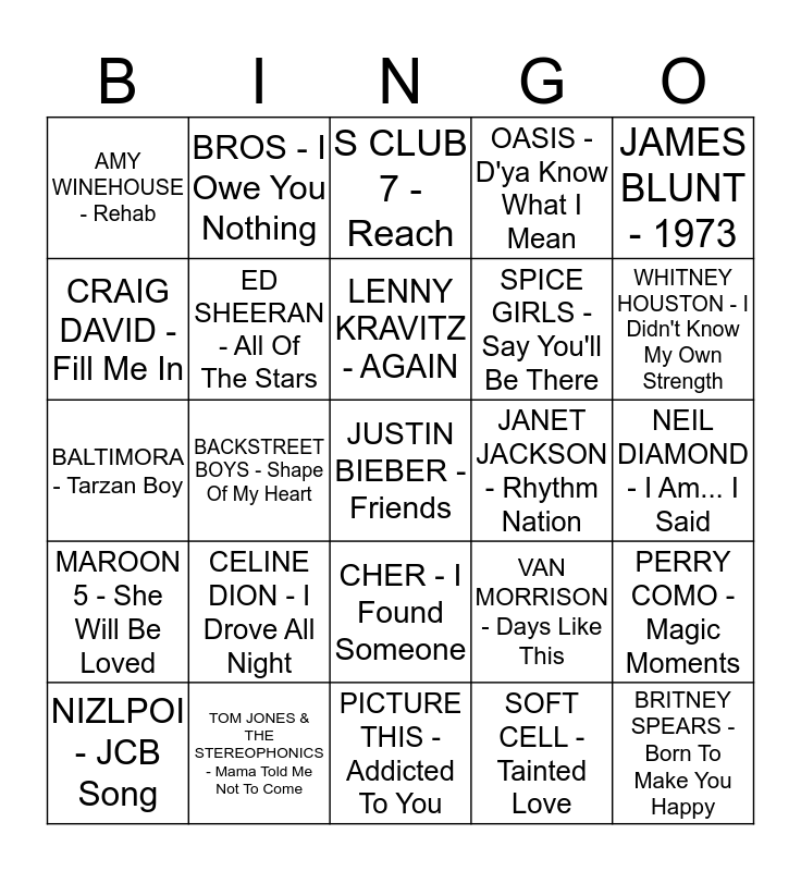 This bingo card has 45 words: JUSTIN TIMBERLAKE - Filthy, JUSTIN BIEBER - Friends, BOYZONE - No Matter What, NIZLPOI - JCB Song, SHERYL CROW - All I Wanna Do, SOFT CELL - Tainted Love, S CLUB 7 - Reach, WESTLIFE - If I Let You Go, JAMES BLUNT - 1973, TOM JONES & THE STEREOPHONICS - Mama Told Me Not To Come, OASIS - D'ya Know What I Mean, JANET JACKSON - Rhythm Nation, CHER - I Found Someone, CELINE DION - I Drove All Night, MICHAEL JACKSON - Will You Be There, PICTURE THIS - Addicted To You, THE HUGHES CORPORATION - Rock The Boat, BALTIMORA - Tarzan Boy, BOBBY BROWN - My Prerogative, WHITNEY HOUSTON - I Didn't Know My Own Strength, BROS - I Owe You Nothing, BARRY MANILOW - Copacabana, TOM CRUISE & MALIN AKERMAN - I Want To Know What Love Is, AMY WINEHOUSE - Rehab, ELVIS PRESLEY - Don't Be Cruel, NEIL DIAMOND - I Am... I Said, CHUBBY CHECKER - Let's Twist Again, THE SUPREMES - Where Did Our Love Go, VAN MORRISON - Days Like This, MAROON 5 - She Will Be Loved, OLLY MURS - Oh My Goodness, PERRY COMO - Magic Moments, EDDIE COCHRAN - C'mon Everybody, ROD STEWART - Do Ya Think I'm Sexy, SCOTT McKENZIE - San Francisco, BACKSTREET BOYS - Shape Of My Heart, HANSON - If Only, GINUWINE - Pony, BRITNEY SPEARS - Born To Make You Happy, LENNY KRAVITZ - AGAIN, CRAIG DAVID - Fill Me In, SPICE GIRLS - Say You'll Be There, LITTLE MIX Ft. Stormzy - Power, ED SHEERAN - All Of The Stars and ROGER MILLER - King Of The Road.